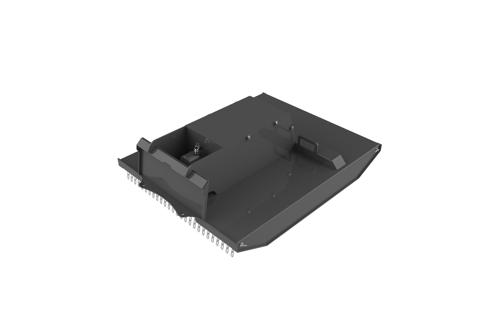 The power is supplied by hydraulic direct drive motor with check value relief and allows machines without a high flow option to be compatible with 15 to 20 GPM. Gear bo turns the blades at around 1060 RPM's with 20 GPM flow, for a very efficient cut. The deck is equipped with a stump jumper between the blades and the deck, to help ride over obstacles like stumps. A safety chain in back, to limit the height your deck can be raised.