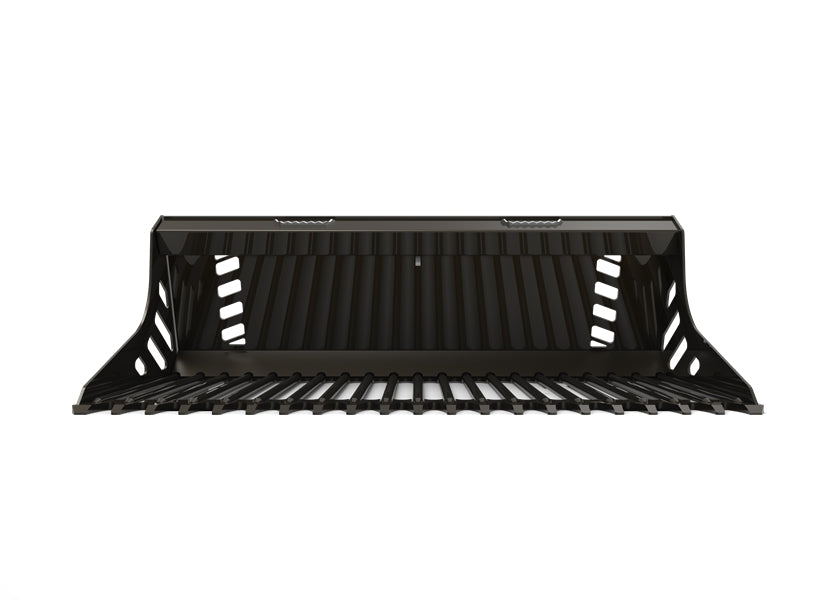 -It features strong round bar tines integrated into a webbed and chamfered cutting edge for increased strength compared to round bar rake buckets.